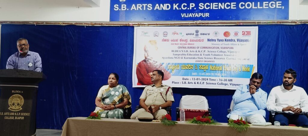 ನಗರದ ಬಿ.ಎಲ್.ಡಿ.ಇ ಸಂಸ್ಥೆಯ ಎಸ್. ಬಿ. ಕಲಾ ಮತ್ತು ಕೆ.ಸಿ.ಪಿ ವಿಜ್ಞಾನ ಮಹಾವಿದ್ಯಾಲಯದಲ್ಲಿ ರಾಷ್ಟ್ರೀಯ ಯುವ ದಿನಾಚರಣೆ ಮತ್ತು ಸಪ್ತಾಹ ಹಿನ್ನೆಲೆಯಲ್ಲಿ ನೆಹರು ಯುವ ಕೇಂದ್ರ ವಿಜಯಪುರ, ಕರ್ನಾಟಕ ರಾಜ್ಯ ವಿಜ್ಞಾನ ಮತ್ತು ಸಂಶೋಧನಾ ಪರಿಷತ್ತು ವಿಜಯಪುರ, ಜಿಲ್ಲಾ ಆಡಳಿತ ಜಿಲ್ಲಾ ಪಂಚಾಯತ, ಯುವ ಕಾರ್ಯ ಮತ್ತು ಕ್ರೀಡಾ ಸಚಿವಾಲಯ ಬಿ.ಎಲ್.ಡಿ.ಇ ಸಂಸ್ಥೆಯ ಎಸ್. ಬಿ. ಕಲಾ ಮತ್ತು ಕೆ.ಸಿ.ಪಿ ವಿಜ್ಞಾನ ಮಹಾವಿದ್ಯಾಲಯ ಎನ್.ಎಸ್.ಎಸ್ ಘಟಕಗಳು, ಯೂತ್ ರೆಡ್ ಕ್ರಾಸ್ ರೆಡ್ ರಿಬ್ಬನ್ ಕ್ಲಬ್, ಸ್ವಯಂ ಸೇವಾ ಸಂಘ ಸಂಸ್ಥೆಗಳ ಸಂಯೋಜನಡಿಯಲ್ಲಿ ಜರುಗಿದ ರಾಷ್ರೀಯ ಯುವ ದಿನಾಚರಣೆಯನ್ನುದ್ದೇಶಿಸಿ ಮಾತನಾಡಿದ ಅವರು, ಸ್ವಾಮಿ ವಿವೇಕಾನಂದರು ದೇಶಕಂಡ ಮಹಾನ್ ಚಿಂತಕರು, ಸನ್ಯಾಸಿಗಳು. ಇವರ ಸಂದೇಶಗಳು ಮಾನವನ ಬದುಕಿಗೆ ಉಪಯುಕ್ತವಾದವುಗಳು. ಇಂದಿನ ಯುವಕರು ಅವರು ಹಾಕಿ ಕೊಟ್ಟಿರುವ ಸನ್ಮಾರ್ಗದಲ್ಲಿ ನಡೆಯಬೇಕಾಗಿದೆ. ಸ್ವಾಮಿ ವಿವೇಕಾನಂದರ ಜೀವನ ಯಶೋಗಾಥೆ ಇಂದಿನ ಯುವಕರು ಅಳವಡಿಸಿಕೊಳ್ಳಬೇಕಾಗಿದೆ. ಯುವಕರು ಸದಾ ಉತ್ಸಾಹ ಭರಿತರಾಗಿ, ಸದಾ ದೇಶದ ಪ್ರಜ್ಞಾವಂತ ಪ್ರಜೆಗಳಾಗಿ ಬದುಕಲು ವಿವೇಕಾನಂದರು ಸ್ಪೂರ್ತಿಯಾಗಿದ್ದಾರೆ ಎಂದು ಹೇಳಿದರು.