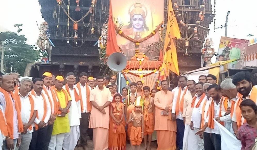 ಗ್ರಾಮದ ಶ್ರೀ ಯಲ್ಲಾಲಿಂಗ ಮಠದಿಂದ ಶ್ರೀ ಗುರು ವೀರಘಂಟೈ ಮಡಿವಾಳೇಶ್ವರ ದೇವಸ್ಥಾನದವರೆಗೆ ಡೊಳ್ಳು ವಾದ್ಯ ಭಾಜಾ ಭಜಂತ್ರಿ ಮೆರವಣಿಗೆಯೊಂದಿಗೆ ಗ್ರಾಮದ ಹಿರೇಮಠದ ಸಿದ್ಧರಾಮ ಶಿವಾಚಾರ್ಯರು ಮತ್ತು ಗದ್ದುಗಿಮಠದ ಮಡಿವಾಳೇಶ್ವರ ಶಿವಾಚಾರ್ಯರ ಸಮ್ಮುಖದಲ್ಲಿ ಶ್ರೀರಾಮ ಭಕ್ತರು, ಯುವ ಸಮೂಹ ರಾಮನಾಮವನ್ನು ಪಠಿಸುತ್ತಾ ಜಯಘೋಷಗಳೊಂದಿಗೆ ಭಕ್ತಿಪೂರ್ವಕವಾಗಿ ಸ್ವಾಗತ ಮಾಡಿಕೊಂಡರು.