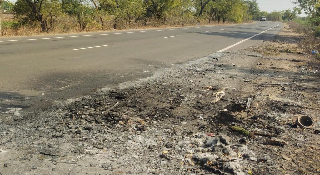 ಮೋರಟಗಿ: ಸಮೀಪದ ಹಂಚಿನಾಳ ಮತ್ತು ಗಬಸಾವಳಗಿ ಗ್ರಾಮದ ಮದ್ಯ ರಾಷ್ಟ್ರೀಯ ಹೆದ್ದಾರಿ ೫೦ ರಲ್ಲಿ ಕಳೆದ ೧೦ನೇ ತಾರೀಕು ಸರ್ಕಾರಿ ಬಸ್ಸಿಗೆ ಬೈಕ್ ಸವಾರನೊಬ್ಬ ಡಿಕ್ಕಿ ಹೊಡೆದ ಪರಿಣಾಮ ಸ್ಪರ್ಶ್ ತೀವ್ರಗೊಂಡು ಬಸ್ಸು ಸುಟ್ಟು ಭಸ್ಮವಾಗಿತ್ತು. ಘಟನೆ ಸಂಭವಿಸಿ ಒಂದು ವಾರ ಕಳೆದರೂ ಅಪಘಾತ ಸಂಭವಿಸಿದ ಸ್ಥಳದಲ್ಲಿ ರಾಷ್ಟ್ರಿಯ ಹೆದ್ದಾರಿ ಅಧಿಕಾರಿಗಳು ಸ್ವಚ್ಛತೆಗೆ ಮುಂದಾಗುತ್ತಿಲ್ಲ ಎಂದು ವಾಹನ ಸವಾರರು ಆಕ್ರೋಶ ವ್ಯಕ್ತಪಡಿಸಿ ಅಧಿಕಾರಿಗಳಿಗೆ ಹಿಡಿಶಾಪ ಹಾಕುತಿದ್ದಾರೆ.