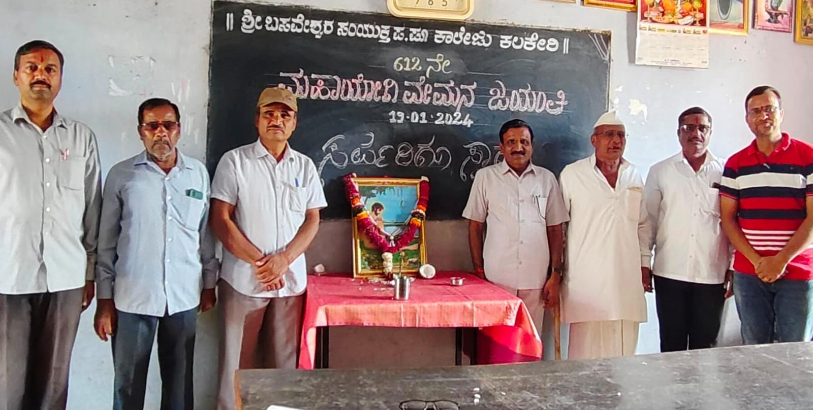 ಕಲಕೇರಿ: ಗ್ರಾಮದ ಮಲ್ಲಿಕಾರ್ಜುನ ವಿದ್ಯಾವರ್ಧಕ ಸಂಘದ ಬಸವೇಶ್ವರ ಸಂಯುಕ್ತ ಪದವಿ ಪೂರ್ವ ಮಹಾವಿದ್ಯಾಲಯದಲ್ಲಿ ಶುಕ್ರವಾರ ಮಹಾಶಿವಯೋಗಿ ವೇಮನರ ಜಯಂತಿಯನ್ನು ಆಚರಿಸಲಾಯಿತು. ಈ ವೇಳೆ ಯೋಗಿ ಮೇಮನರ ಭಾವಚಿತ್ರಕ್ಕೆ ಪೂಜೆಯನ್ನು ಸಲ್ಲಿಸಲಾಯಿತು.