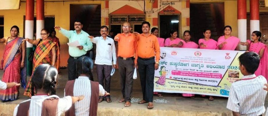 ನಗರ ಆರೋಗ್ಯ ನಿರೀಕ್ಷಣಾಧಿಕಾರಿ ಎಂ.ಎಸ್.ಗೌಡರ ವಿದ್ಯಾರ್ಥಿಗಳಿಗೆ ಸ್ಪರ್ಶ್ ಕುಷ್ಠರೋಗ ಜಾಗೃತಿ ಅಭಿಯಾನದ ಭಿತ್ತಿಪತ್ರಗಳನ್ನು ವಿತರಿಸಿ ಪ್ರತಿಜ್ಞಾ ವಿಧಿಯನ್ನು ಬೋಧಿಸಿದರು.