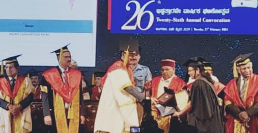 ಬೆಂಗಳೂರಿನ ರಾಜೀವ್ ಗಾಂಧಿ ಆರೋಗ್ಯ ವಿಜ್ಞಾನ ವಿಶ್ವವಿದ್ಯಾಲಯದಲ್ಲಿ ಫೆ. 27 ರಂದು ನಡೆದ 26ನೇಯ ಘಟಿಕೋತ್ಸವದಲ್ಲಿ ರಾಜ್ಯಪಾಲ ಥಾವರಚಂದ ಗೆಹ್ಲೋಟ್, ವೈಧ್ಯಕೀಯ ಶಿಕ್ಷಣ ಸಚಿವ ಡಾ. ಶರಣಪ್ರಕಾಶ ಪಾಟಿಲ, ವಿಶ್ವ ವಿದ್ಯಾಲಯದ ಉಪಕುಲಪತಿ ಡಾ. ಕೆ. ರಮೇಶ ಅವರು ಚಿನ್ನದ ಪದಕ ಪ್ರಧಾನ ಮಾಡಿದರು.