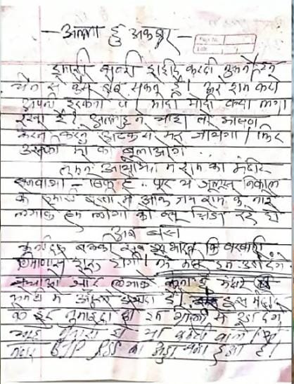 ಪತ್ರದಲ್ಲಿ ‘ಅಲ್ಲಾಹು ಅಕ್ಬರ್’ ಎಂಬ ಬರಹ ಇದೆ ಎನ್ನಲಾಗಿದೆ. “ನಿಮ್ಮ ರಾಮಮಂದಿರ ಸ್ಫೋಟಿಸುತ್ತೇವೆ. ದೊಡ್ಡ ಪ್ರಮಾಣದಲ್ಲೇ ಸ್ಫೋಟಿಸುತ್ತೇವೆ, ಸುಧಾರಿಸಿಕೊಳ್ಳಿ” ಅಂತ ಪತ್ರದಲ್ಲಿ ಬೆದರಿಕೆ ಒಡ್ಡಲಾಗಿದೆ. ಫೆಬ್ರವರಿ 29 ಹಾಗೂ 28ರ ದಿನಾಂಕದಲ್ಲಿ ಪತ್ರ ಬರೆದಿದ್ದು, ಇದೀಗ ಬೆಳಕಿಗೆ ಬಂದಿದೆ. ಮುಂದಿನ 20 ಹಾಗೂ 21ನೇ ತಾರೀಖಿನ ಒಳಗಡೆ ಸ್ಫೋಟಿಸುವುದಾಗಿ ಅನಾಮಧೇಯ ಪತ್ರದಲ್ಲಿ ಉಲ್ಲೇಖಿಸಲಾಗಿದೆ. ಅಲ್ಲದೆ ಕಳೆದ ಫೆಬ್ರವರಿ 27 ಹಾಗೂ 28ರಂದೇ ದೇವಸ್ಥಾನದಲ್ಲಿ ಅನಾಮಧೇಯ ವ್ಯಕ್ತಿ ಬೆದರಿಕೆ ಪತ್ರ ಇಟ್ಟು ಹೋಗಿದ್ದಾನೆ ಎನ್ನಲಾಗಿದ್ದು, ಮುಂದಿನ 20 ಹಾಗೂ 21ನೇ ತಾರೀಖಿನ ಒಳಗೆ ಸ್ಫೋಟಿಸುತ್ತೇವೆ ಅಂತ ಬೆದರಿಕೆ ಒಡ್ಡಲಾಗಿದೆ.