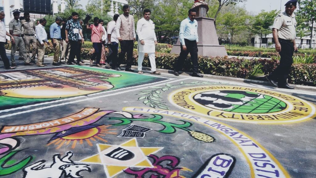 ವಿಜಯಪುರ: ನಗರದ ಪ್ರತಿಷ್ಠಿತ ಬಿ.ಎಲ್.ಡಿ.ಇ ಡೀಮ್ಡ್ ವಿಶ್ವವಿದ್ಯಾಲಯದ ಶ್ರೀ ಬಿ. ಎಂ. ಪಾಟೀಲ ವೈದ್ಯಕೀಯ ಕಾಲೇಜು, ಆಸ್ಪತ್ರೆ ಮತ್ತು ಸಂಶೋಧನೆ ಕೇಂದ್ರದ 1500 ವಿದ್ಯಾರ್ಥಿಗಳು ಸ್ವಾಸ್ಷ್ಟ ಸಂತುಲನ ರಂಗೋಲಿ ಮಹೋತ್ಸವದಲ್ಲಿ ಪಾಲ್ಗೋಂಡು ವೈದ್ಯಕೀಯ ಶಿಕ್ಷಣ ಕ್ಷೇತ್ರಕ್ಕೆ ಸಂಬಂಧಿಸಿದ 250 ರಂಗೋಲಿ ಚಿತ್ರಗಳನ್ನು ಬಿಡಿಸಿ ಗಮನ ಸೆಳೆದರು. ತಲಾ ಐದಾರು ವೈದ್ಯಕೀಯ ವಿದ್ಯಾರ್ಥಿಗಳು ತಂಡದ ರೂಪದಲ್ಲಿ ತಮ್ಮ ವೈದ್ಯಕೀಯ ಪಠ್ಯಕ್ರಮಕ್ಕೆ ಸಂಬಂಧಿಸಿದ ರಂಗೋಲಿ ಚಿತ್ರಗಳನ್ನು ಬಿಡಿಸಿದರು. ಬಿ.ಎಲ್.ಡಿ.ಇ ವಿವಿಯ 24 ವಿಭಾಗಗಳ ವಿದ್ಯಾರ್ಥಿಗಳಿಗೆ ಕಾಲೇಜಿನ ಶಿಕ್ಷಕರು, 40 ಜನ ಮಾರ್ಗದರ್ಶಕರು ಮತ್ತು 20 ಜನ ಮೇಲ್ವಿಚಾರಕರು ಬನ್ನೆಲುಬಾಗಿ ನಿಂತಿದ್ದರು. ಒಟ್ಟು 50 ಸಾವಿರ ಚದುರ ಅಡಿ ಪ್ರದೇಶದಲ್ಲಿ 10 ಟನ್ ರಂಗೋಲಿ ಬಳಕೆಯಾಗುತ್ತಿದೆ. 10 ಅಡಿ ಉದ್ದ, 12 ಅಡಿ ಅಗಲ ಅಳತೆಯ 250 ರಂಗೋಲಿ ಚಿತ್ರಗಳನ್ನು ಬಿಡಿಸಲಾಯಿತು.