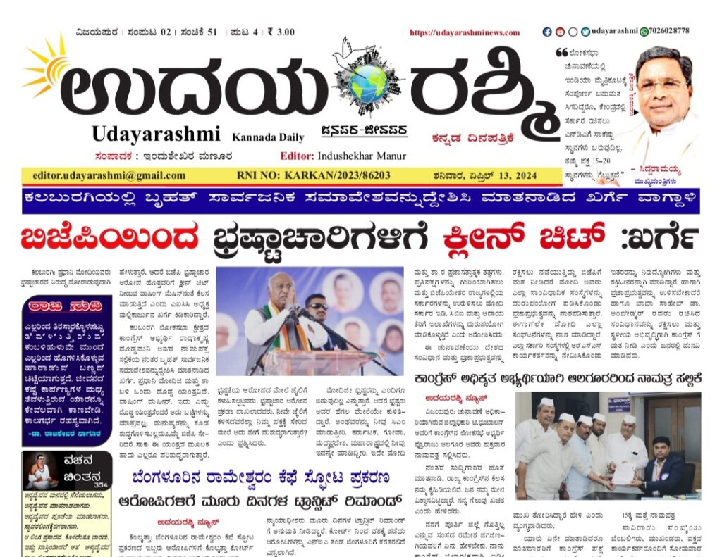 ಉದಯರಶ್ಮಿ ಇಂದಿನ ದಿನಪತ್ರಿಕೆ ಎಪ್ರಿಲ್ 13, 2024