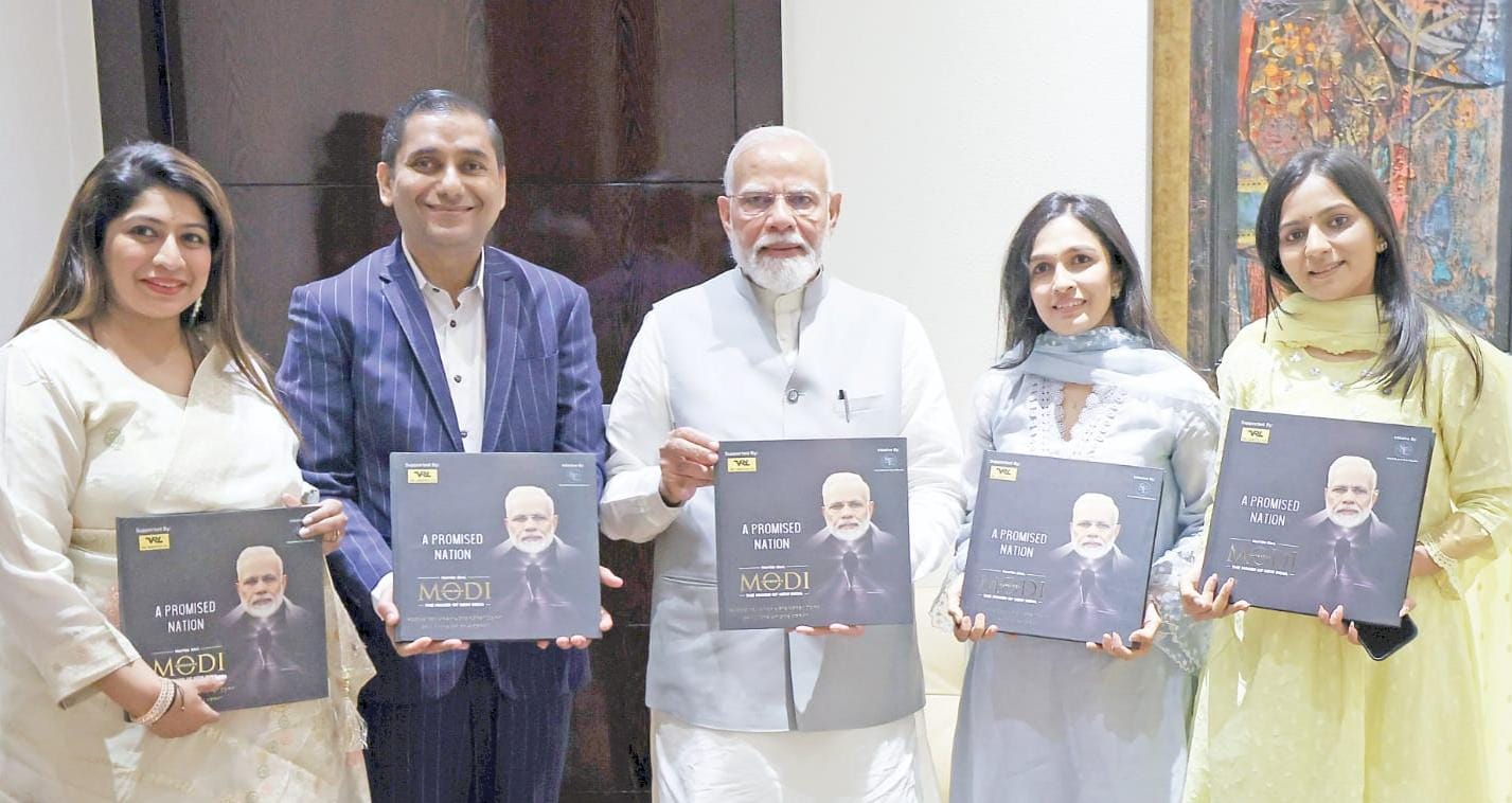 ಬೆಂಗಳೂರಿಗೆ ಆಗಮಿಸಿದ್ದ ಪ್ರಧಾನಿ ನರೇಂದ್ರ ಮೋದಿ ಅವರನ್ನು ಭೇಟಿಯಾದ ವಿಆರ್ಎಲ್ ಸಮೂಹ ಸಂಸ್ಥೆಯ ವ್ಯವಸ್ಥಾಪಕ ನಿರ್ದೇಶಕರಾದ ಡಾ. ಆನಂದ ಸಂಕೇಶ್ವರ, ವಾಣಿ ಆನಂದ ಸಂಕೇಶ್ವರ, ರುಷಾಲಿ, ಯಶ್ವಿ ಅವರು ಪುಸ್ತಕದ ಐದು ಪ್ರತಿಗಳನ್ನು ಅರ್ಪಿಸಿದರು.