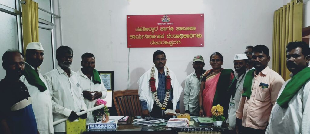 ಪಟ್ಟಣದ ತಹಶೀಲ್ದಾರ ಕಾರ್ಯಾಲಯದಲ್ಲಿ ಮಂಗಳವಾರ ದೇವೂರ ಗ್ರಾಮದ ರಸ್ತೆ ಸಮಸ್ಯೆ ನಿವಾರಿಸಿ ಪರಿಹಾರ ದೊರಕಿಸಿದ ಕಾರಣ ತಹಶೀಲ್ದಾರ ಪ್ರಕಾಶ ಸಿಂದಗಿ ಅವರನ್ನು ಸನ್ಮಾನಿಸಿ ಮಾತನಾಡಿದರು. ಪ್ರತಿಯೊಂದು ಗ್ರಾಮದಲ್ಲಿ ರೈತರು ಜಮೀನುಗಳ ರಸ್ತೆ ವಿಷಯದಲ್ಲಿ ಸಮಸ್ಯೆ ಎದುರಿಸುತ್ತಿದ್ದು, ಕೆಲವರು ಹಲವು ವರ್ಷಗಳಿಂದ ಪೊಲೀಸ್ ಠಾಣೆ, ನ್ಯಾಯಾಲಯಗಳಿಗೆ ಅಲೆದಾಡುತ್ತಿದ್ದಾರೆ. ಅದಾಗ್ಯೂ ನ್ಯಾಯ ದೊರೆತಿಲ್ಲ. ಆದರೆ ನಮ್ಮ ತಾಲ್ಲೂಕಿನ ತಹಶೀಲ್ದಾರರು ದಿಟ್ಟ ಕ್ರಮ ಕೈಗೊಂಡು ರಸ್ತೆ ಸಮಸ್ಯೆಗೆ ಪರಿಹಾರ ನೀಡಿದ್ದಾರೆ. ಅವರಿಗೆ ಗ್ರಾಮಸ್ಥರ ಪರವಾಗಿ ಅಭಿನಂದನೆ ಎಂದರು.