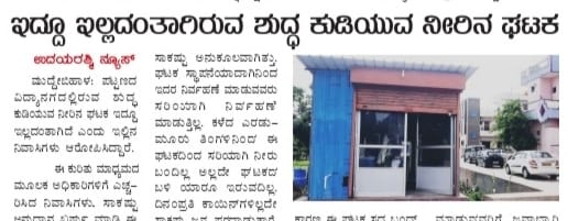 ಮುದ್ದೇಬಿಹಾಳ: ಪಟ್ಟಣದ ವಿದ್ಯಾನಗರದಲ್ಲಿರುವ ಶುದ್ಧ ಕುಡಿಯುವ ನೀರಿನ ಘಟಕದಲ್ಲಿ ಕಳೆದ ಕೆಲವು ತಿಂಗಳುಗಳಿಂದ ನೀರು ಬಾರದೇ ಇಲ್ಲಿನ ನಿವಾಸಿಗಳು ಸಮಸ್ಯೆ ಎದುರಿಸುತ್ತಿದ್ದರು. ಈ ಬಗ್ಗೆ ’ಉದಯರಶ್ಮಿ’ ಪತ್ರಿಕೆಯ ಬುಧವಾರದ ಸಂಚಿಕೆಯಲ್ಲಿ “ಇದ್ದೂ ಇಲ್ಲದಂತಿರುವ ಶುದ್ಧ ನೀರಿನ ಘಟಕ” ಎಂಬ ತಲೆಬರಹದಡಿ ಜೂ.೨೦ ರಂದು ವರದಿ ಬಿತ್ತರಿಸಿ ಅಧಿಕಾರಿಗಳ ಗಮನ ಸೆಳೆದಿತ್ತು. ವರದಿ ಪ್ರಕಟವಾಗುತ್ತಿದ್ದಂತೆ ಎಚ್ಚೆತ್ತ ಪುರಸಭೆ ಅಧಿಕಾರಿಗಳು ಶುದ್ಧ ಕುಡಿಯುವ ನೀರಿನ ಘಟಕವನ್ನು ದುರಸ್ತಿಗೊಳಿಸಿ ಸಮಸ್ಯೆಗೆ ಪರಿಹಾರ ಕಲ್ಪಿಸಿ ಕೊಟ್ಟಿದ್ದಾರೆ.