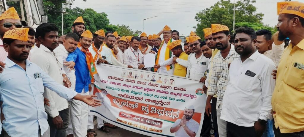 ಈ ಸಂದರ್ಭದಲ್ಲಿ ಮಾಜಿಶಾಸಕ ಸೋಮನಗೌಡ ಪಾಟೀಲ(ಸಾಸನೂರ) ಮಾತನಾಡಿ, ಪೆಟ್ರೋಲ್, ಡೀಸೆಲ್ ಮೇಲಿನ ತೆರಿಗೆ ಹೆಚ್ಚಳ ಮಾಡಿ ಲೀಟರ್ಗೆ ತಲಾ ೩ ರಿಂದ ೩.೫೦ ರೂ.ಏರಿಕೆ ಮಾಡಿರುವುದರಿಂದ ರಾಜ್ಯದ ಜನತೆಗೆ ಬರೆ ಎಳೆದಂತಾಗಿದೆ. ಜೊತೆಗೆ ವಾಲ್ಮಿಕಿ ನಿಗಮದ ೧೮೭ ಕೋಟಿಗಳ ಭ್ರಷ್ಟಾಚಾರ ಹಾಗೂ ಬಾಂಡ್ ಪೇಪರ್, ಮದ್ಯದ ಬೆಲೆಗಳ ಹೆಚ್ಚಳ, ಹದಗೆಟ್ಟ ಕಾನೂನು ವ್ಯವಸ್ಥೆಗಳು ಆರ್ಥಿಕ ತಜ್ಞರೆಂದೇ ಬಿಂಬಿಸಿಕೊಳ್ಳುವ ಸಿದ್ಧರಾಮಯ್ಯ ಸರ್ಕಾರದ ಆಡಳಿತ ವೈಖರಿಗೆ ಕೈಗನ್ನಡಿ ಹಿಡಿದಂತಾಗಿದೆ. ಕೂಡಲೇ ರಾಜ್ಯಪಾಲರು ಇಂಥ ಜನವಿರೋಧಿ ಸರ್ಕಾರವನ್ನು ವಜಾಗೊಳಿಸಬೇಕು ಎಂದು ಆಗ್ರಹಿಸಿದರು.