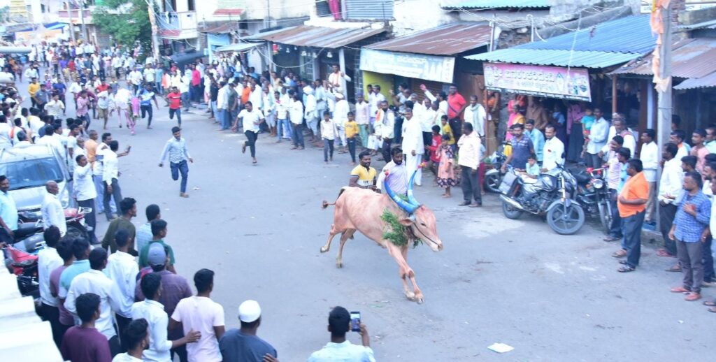 ಶನಿವಾರ ಸಂಜೆ ಗ್ರಾಮದ ಪ್ರಮುಖ ಬೀದಿಯಲ್ಲಿ ಹಮ್ಮಿಕೊಳ್ಳಲಾಗಿದ್ದ ಕರಿ ಹರಿಯುವ ಸ್ಪರ್ದೆಯಲ್ಲಿ ಕೆಂಪು ಎತ್ತು ಹಾಗೂ ಬಿಳಿ ಎತ್ತುಗಳನ್ನು ಸ್ಪರ್ದೆಗೆ ಅಣಿಗೊಳಿಸಲಾಗಿತ್ತು. ಗ್ರಾಮದ ಪ್ರಮುಖರಿಂದ ತೆಂಗಿನಕಾಯಿ ಒಡೆಯುವ ಮೂಲಕ ಸ್ಪರ್ದೆಗೆ ಚಾಲನೆ ನೀಡಲಾಯಿತು.