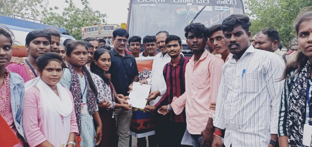 ಇಂಡಿ: ಅಖಿಲ ಭಾರತೀಯ ವಿದ್ಯಾರ್ಥಿ ಪರಿಷತ್ತಿನಿಂದ ಬುಧವಾರ ವಿಜಯಪುರ ರಸ್ತೆಯ ರಾಷ್ಟ್ರೀಯ ಹೆದ್ದಾರಿಯಲ್ಲಿ ರಸ್ತಾರೋಕ್ ಮಾಡಿ ವಿದ್ಯಾರ್ಥಿಗಳು ಪ್ರತಿಭಟನೆ ನಡೆಸಿ ಕೆಎಸ್ಆರ್ಟಿಸಿ ವ್ಯವಸ್ಥಾಪಕ ಎಸ್.ಜಿ. ಬಿರಾದಾರ ಅವರಿಗೆ ಮನವಿ ನೀಡಿದರು.