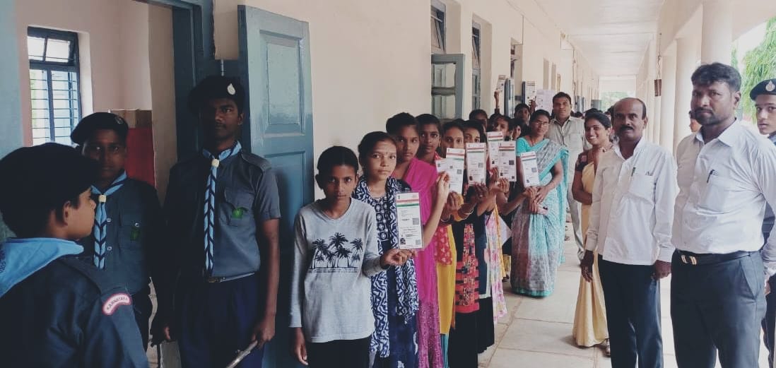 ಮಕ್ಕಳು ಗುರುತಿನ ಚೀಟಿ ಆಧಾರಕಾರ್ಡದೊಂದಿಗೆ ತಮ್ಮ ಮತಹಕ್ಕು ಚಲಾಯಿಸಲು ಸರತಿ ಸಾಲಿನಲ್ಲಿ ನಿಂತು ಮತಗಟ್ಟೆ ಕೇಂದ್ರದೊಳಗಡೆ ತೆರಳಿ ಮತದಾನ ಮಾಡಿ ಖುಷಿಯಿಂದ ಹೊರಬಂದರು.