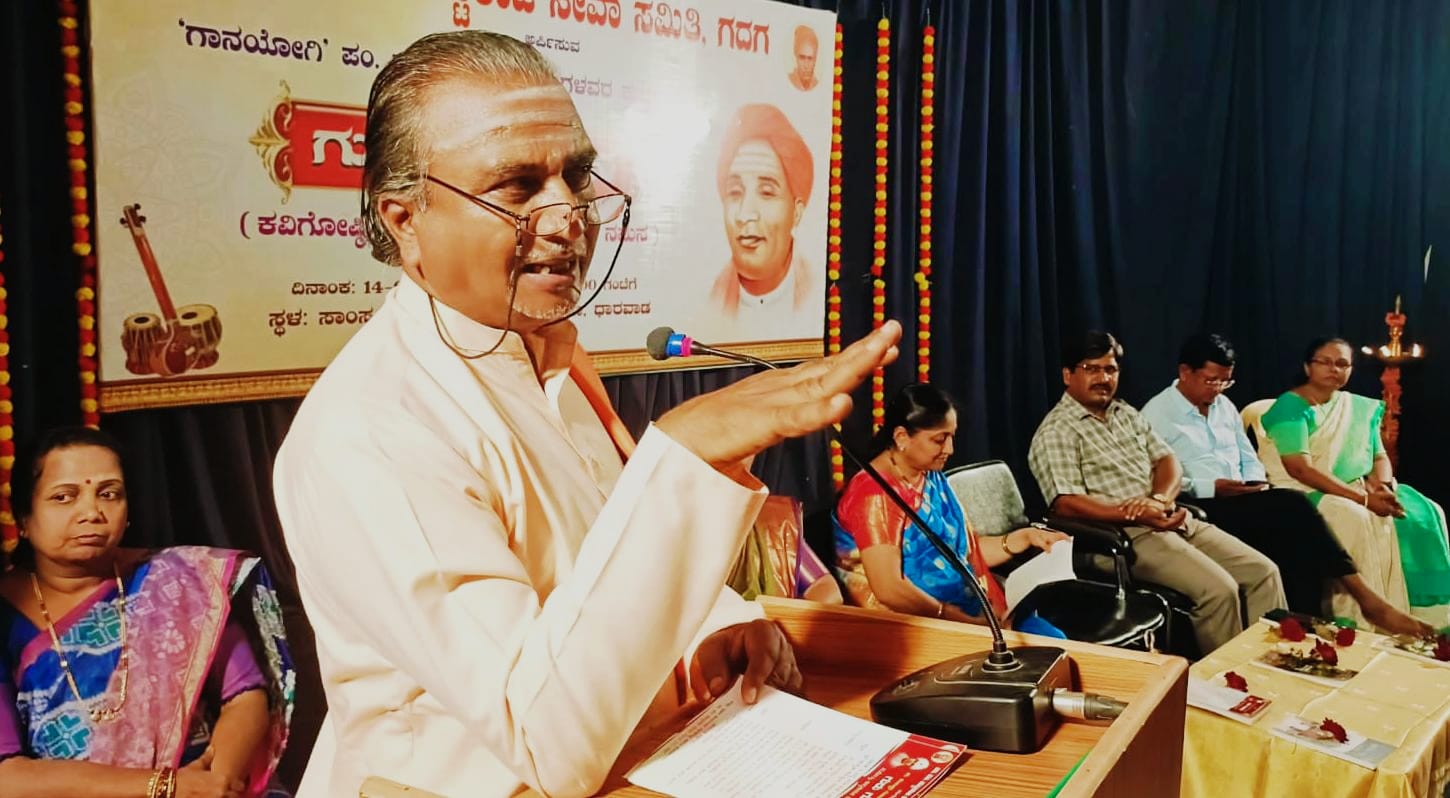 ಅವರು ಜು.೧೪ ರಂದು ಸಂಜೆ ಧಾರವಾಡದ ರಂಗಾಯಣದಲ್ಲಿ, ಗದುಗಿನ ಡಾ. ಪಂ. ಪುಟ್ಟರಾಜ ಸೇವಾ ಸಮಿತಿ ಆಯೋಜಿಸಿದ್ದ ಗಾನಯೋಗಿ ಪಂ. ಪಂಚಾಕ್ಷರ ಗವಾಯಿಗಳವರ ೮೦ನೆಯ ಪುಣ್ಯಸ್ಮರಣೆ ‘ಗುರು ಗುಣಗಾನ’ ಕವಿಗೋಷ್ಠಿ, ಕಾವ್ಯಗಾಯನ ಮತ್ತು ನೃತ್ಯ ನಮನವನ್ನು ಒಳಗೊಂಡ ಸಮಾರಂಭದ ಅಧ್ಯಕ್ಷತೆಯನ್ನು ವಹಿಸಿಕೊಂಡು ಮಾತನಾಡಿದರು. ಶ್ರೀಮತಿ ಮೃಣಾಲ ಜೋಶಿ ಗುರು ಪಂಚಾಕ್ಷರಿ ಗವಾಯಿಗಳವರ ಜೀವನ ಸಾಧನೆ ಸಂದೇಶವನ್ನು ವಿವರವಾಗಿ ವಿವರಿಸಿ ಪೂಜ್ಯರ ಕನ್ನಡ ಅಭಿಮಾನ, ಸ್ವದೇಶಿ ಅಭಿಮಾನ ಕುರಿತು ತಿಳಿಸಿದ್ದಲ್ಲದೆ ಅವರ ಆರೋಗ್ಯ ಕೆಟ್ಟಾಗ ದೇಶಿ ಔಷಧಿಯನ್ನೇ ಸ್ವೀಕರಿಸಿದ್ದರು. ಅವರು ಕೇವಲ 52 ವರ್ಷ ಬದುಕಿದ್ದರೂ ಆ ಸಾಮಾನ್ಯ ಸಾಧನೆ ಮಾಡಿದ ಪೂಜ್ಯ ಪಂಚಾಕ್ಷರ ಗವಾಯಿಗಳ ತತ್ವ ಆಚರಣೆ ಅಳವಡಿಸಿಕೊಳ್ಳುವ ಮೂಲಕ ನಾವು ಪಂಚಾಕ್ಷರ ಗವಾಯಿಗಳನ್ನು ಮನೆ ಮನೆಗೆ ಕರೆದೊಯ್ಯಬೇಕು ಎಂದು ಮನ ಮುಟ್ಟುವ ಹಾಗೆ ಮಾತಾಡಿದರು.