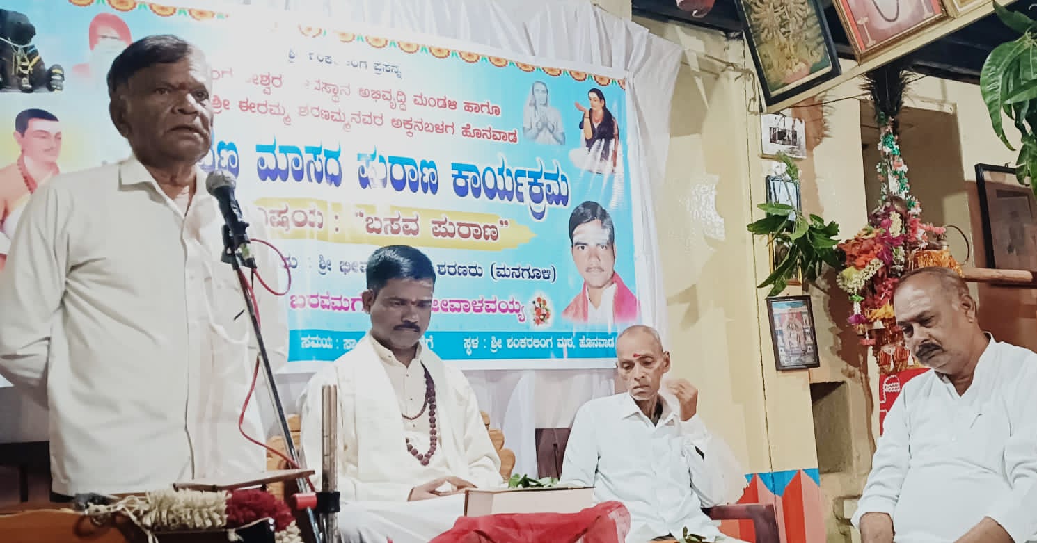 ತಿಕೋಟಾ ತಾಲ್ಲೂಕಿನ ಹೊನವಾಡ ಗ್ರಾಮದಲ್ಲಿ ಶ್ರೀ ಸಂಗಮೇಶ್ವರ ದೇವಸ್ಥಾನ ಅಭಿವೃದ್ಧಿ ಮಂಡಳಿ ಹಾಗೂ ಮಾತೊಶ್ರೀ ಈರಮ್ಮ ಶರಣಮ್ಮನವರ ಅಕ್ಕನ ಬಳಗದ ವತಿಯಿಂದ ಶ್ರಾವಣ ಮಾಸದ ಪ್ರಯುಕ್ತ ಬಸವ ಪುರಾಣ ಕಾರ್ಯಕ್ರಮದಲ್ಲಿ ಅವರು ಮಾತನಾಡಿದರು.