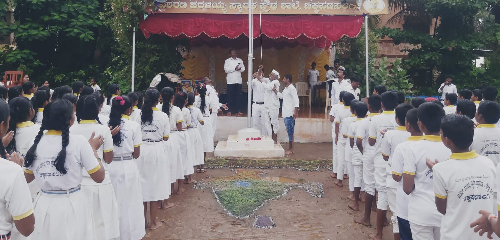 ಇಲ್ಲಿನ ಶಿವಶರಣ ಹರಳಯ್ಯ ಸ್ಮಾರಕ ಪ್ರೌಢಶಾಲೆಯಲ್ಲಿ ಸ್ವಾತಂತ್ರ್ಯೋತ್ಸವ ಕಾರ್ಯಕ್ರಮದ ಮುನ್ನಾದಿನ ಬುಧವಾರ ಶಾಲಾಂಗಳ ಶುಚಿಗೊಳಿಸಿ ಸುಣ್ಣದ ಮಾಕಿ೯ಂಗ್ ಲೇನ್ ಔಟ್ ಹಾಕಲಾಗಿತ್ತು. ಭಾರತ ನಕ್ಷೆ ಚಿತ್ರಕ್ಕೆ ತ್ರಿವರ್ಣ ಬಣ್ಣದ ಹಾಗೂ ಶಾಲಾವರಣದ ರಸ್ತೆ ಅಕ್ಕಪಕ್ಕದಲ್ಲಿ ರಂಗೋಲಿ ಚಿತ್ತಾರ ಮೂಡಿದ್ದವು ಆದರೆ 15 ರ ಮಧ್ಯರಾತ್ರಿ ವ್ಯಾಪಕ ಮಳೆ ಸುರಿದ ಪರಿಣಾಮ ಅವೆಲ್ಲವೂ ನೀರಿಗೆ ಹೋಮವಾದವು. ಬೆಳಿಗ್ಗೆ ಶಾಲಾ ಸಿಬ್ಬಂದಿ ಹಾಗೂ ಶಾಲಾ ಮಕ್ಕಳು ಆಗಮಿಸಿ ನೋಡಿದಾಗ ಕಲರ್ಸ ರಂಗೋಲಿ ಮಾಯವಾಗಿದ್ದನ್ನು ಕಂಡು ಬೆರಗಾದರು. ಪುನಃ ಅಲ್ಪಾವಧಿಯ ಸಮಯದಲ್ಲೇ ಬಣ್ಞ ಬಣ್ಣದ ರಂಗೋಲಿ ಹಾಕಿ ಮತ್ತೆ ಸ್ವಾತಂತ್ರ್ಯ ಕಾರ್ಯಕ್ರಮಕ್ಕೆ ನೆಲವನ್ನು ರಂಗೋಲಿ ಕಲರದಿಂದ ಅಣಿಗೊಳಿಸಿ ನಿಟ್ಟುಸಿರು ಬಿಡುತ್ತಿರುವಾಗಲೇ ಮತ್ತೆ ಧೋ ಧೋ ಎಂದು ಮಳೆ ಸುರಿಯಲಾರಂಭಿಸಿತು. ಆಗ ಪುನಃ ನೆಲದ ಮೇಲಿನ ಚಿತ್ತಾಕರ್ಷಕ ಸಿಂಗಾರ ಮಾಯವಾಗಿ ತಣ್ಣೀರೆರಚಿತು.