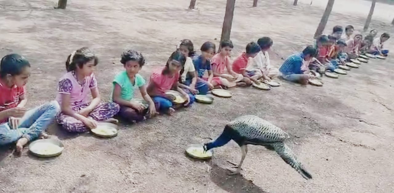 ಸರ್ಕಾರಿ ಶಾಲೆಗೆ ಬಂದ ರಾಷ್ಟ್ರಪಕ್ಷಿ; ಮಕ್ಕಳೊಂದಿಗೆ ಬಿಸಿಯೂಟ ಸೇವನೆ!
