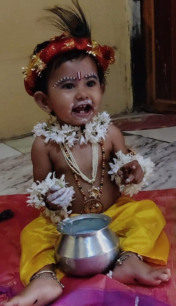 ವಿಜಯಪುರ: ಜಿಲ್ಲೆಯ ಆಲಮೇಲ ತಾಲೂಕಿನ ಮದನಹಳ್ಳಿ ಗ್ರಾಮದ ಶಿವಶರಣ ಗತ್ತರಗಿ ಮತ್ತು ಶ್ರೀಮತಿ ನಿರಂಜನಾ ಶಿವಶರಣ ದಂಪತಿಯ ೧.೧ ವರ್ಷದ ಮುದ್ದಿನ ಕುವರಿ ಶ್ರೀನಿಕಾ ಶ್ರೀಕೃಷ್ಣ ಗೋಕುಲಾಷ್ಟಮಿ ದಿನದಂದು ಬೆಣ್ಣೆ ಕದ್ದು ತಿನ್ನುವ ಬಾಲಕೃಷ್ಣ ನ ವೇಷದಲ್ಲಿ ಕಂಗೊಳಿಸಿದ್ದು ಹೀಗೆ..