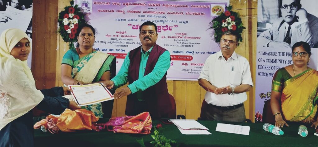 ನಗರದ ಕರ್ನಾಟಕ ರಾಜ್ಯ ಅಕ್ಕಮಹಾದೇವಿ ಮಹಿಳಾ ವಿಶ್ವವಿದ್ಯಾನಿಲಯದ ವಿದ್ಯಾರ್ಥಿನಿ ಕ್ಷೇಮಪಾಲನ ನಿರ್ದೇಶನಾಲಯ ಹಾಗೂ ಕರ್ನಾಟಕ ರಾಜ್ಯ ಸಹಕಾರ ಮಹಾಮಂಡಳ ಇವರ ಸಹಯೋಹಗದಲ್ಲಿ ಗುರುವಾರ ಆಯೋಜಿಸಿದ್ದ ಸಹಕಾರ ತತ್ವದ ಕುರಿತ ಸ್ನಾತಕ ಹಾಗೂ ಸ್ನಾತಕೋತ್ತರ ವಿದ್ಯಾರ್ಥಿನಿಯರಿಗೆ ಅಂತರ್ ಕಾಲೇಜು ಮಟ್ಟದ ಚರ್ಚಾ ಸ್ಪರ್ಧೆಯ ವಿಜೇತರಿಗೆ ಬಹುಮಾನ ವಿತರಿಸಿ ಅವರು ಮಾತನಾಡಿದರು.