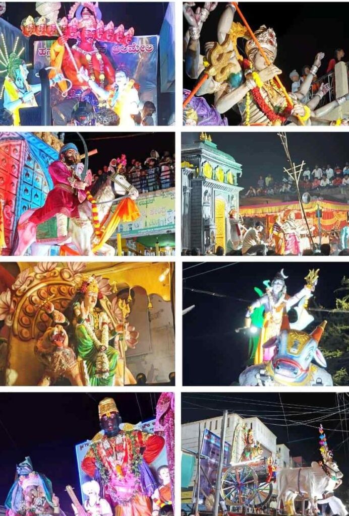 ಮಹಾಭಾರತ ಮತ್ತು ರಾಮಯಣ ಹಾಗೂ ಹೆಸರಾಂತ ದೇವರ ಅವತಾರಗಳು, ದೇಶದ ರಾಜ ಮಹಾರಜರ, ಪಸ್ತುತ ಸನ್ನಿವೇಶಗಳಿಗೆ ತಕ್ಕಂತೆ ಸ್ತಬ್ದಚಿತ್ರ, ರೂಪಕಗಳನ್ನು ನಿರ್ಮಾಣ ಮಾಡಲಾಗಿತ್ತು. ಪಟ್ಟಣದಲ್ಲಿ ಸುಮಾರು ೧೫ ಕ್ಕೂ ಹೆಚ್ಚು ಕಡೆಗಳಲ್ಲಿ ಸಾರ್ವಜನಿಕವಾಗಿ ಪ್ರತಿಷ್ಠಾಪಿಸಿದ ಗಣೇಶ ೫ನೇ ದಿನಕ್ಕೆ ಏಕ ಕಾಲಕ್ಕೆ ಸಾಲಾಗಿ ವಿಸರ್ಜನೆಗೆ ಹೋಗುವದು. ಎಲ್ಲ ಗಜಾನನ ಮಂಡಳಿಯವರು ಲಕ್ಷಾನುಗಟ್ಟಲೆ ಖರ್ಚು ಮಾಡಿ ಸ್ತಬ್ದಚಿತ್ರಗಳು ತಯಾರಿಸಿ ಮೈಸೂರು ದಸರಾ, ಪುಣೆ ಮಾದರಿಯಂತೆ ಗೋಚರಿಸಿ ನೋಡುಗರನ್ನು ಮಗ್ನರನ್ನಾಗಿ ಮಾಡಿತು.