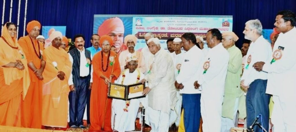 ಗಣ್ಯರ ಸಮ್ಮುಖದಲ್ಲಿ ನಾಡೋಜ ಸಾಹಿತಿ ಗೊ.ರು.ಚನ್ನಬಸಪ್ಪ ಅವರಿಗೆ ಸಿದ್ದಲಿಂಗ ಪೂಜ್ಯರ ಹೆಸರಿನಲ್ಲಿರುವ ಐದು ಲಕ್ಷ ನಗದು ರೂಪಾಯಿ ಹಾಗೂ ಫಲಕವದೊಂದಿಗೆ ರಾಷ್ಟ್ರೀಯ ಪ್ರಶಸ್ತಿ ಪ್ರಧಾನ ಮಾಡಿ ಸನ್ಮಾನಿಸಿ ಗೌರವಿಸಲಾಯಿತು