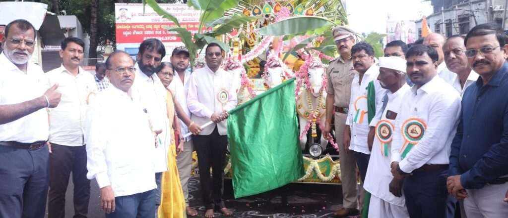 ಮೆರವಣಿಗೆಯು ನಗರದ ಲಾಲ್ ಬಹದ್ದೂರ್ ಶಾಸ್ತ್ರಿ ಮಾರುಕಟ್ಟೆ ರಸ್ತೆ ಮೂಲಕ, ಗಾಂಧಿ ವೃತ್ತ, ಬಸವೇಶ್ವರ ವೃತ್ತ, ಡಾ.ಬಿ.ಆರ್. ಅಂಬೇಡ್ಕರ್ ವೃತ್ತ, ಕನಕದಾಸ ವೃತ್ತದ ಮೂಲಕ ರಂಗಮಂದಿರ ತಲುಪಿತು. ಮೆರವಣಿಗೆಯಲ್ಲಿ ಗೊಂಬೆ ಕುಣಿತ, ಕರಡಿ ಮಜಲು ಸೇರಿದಂತೆ ವಿವಿಧ ವಾದ್ಯಮೇಳ ಹಾಗೂ ಕಲಾ ತಂಡಗಳು ಆಕರ್ಷಕ ಪ್ರದರ್ಶನ ನೀಡಿದರು.