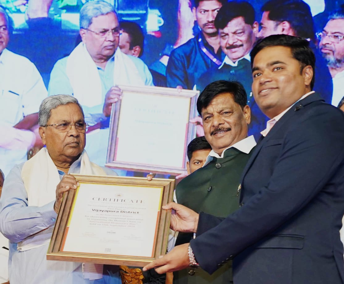 ಪ್ರಜಾಪ್ರಭುತ್ವ ಜಾಗೃತಿ ಮೂಡಿಸಲು ಬೀದರನಿಂದ ಚಾಮರಾಜನಗರವರೆಗೆ ಮಾನವ ಸರಪಳಿ ನಿರ್ಮಾಣ ಹಾಗೂ ವಿಶಿಷ್ಟ ವಿವಿಧ ಕಾರ್ಯಕ್ರಮಗಳನ್ನು ಹಮ್ಮಿಕೊಂಡು ವಲ್ಡ್ ಆಫ್ ಬುಕ್ ರೆಕಾರ್ಡ ಸೇರ್ಪಡೆಗೊಂಡಿದ್ದು, ಈ ಪೈಕಿ ವಿಜಯಪುರ ಜಿಲ್ಲೆಗೆ ನಾವೀನ್ಯತೆ ವಿಭಾಗದಲ್ಲಿ ಪ್ರಥಮ ಸ್ಥಾನ ಸಂದಿರುವ ಹಿನ್ನಲೆಯಲ್ಲಿ ನವೆಂಬರ್ ೨೬ ರಂದು ಬೆಂಗಳೂರಿನ ಡಾ.ಬಿ.ಆರ್.ಅಂಬೇಡ್ಕರ್ ಭವನದಲ್ಲಿ ಆಯೋಜಿಸಿದ್ದ ಸಂವಿಧಾನ ದಿನಾಚರಣೆ ಕಾರ್ಯಕ್ರಮದಲ್ಲಿ ಮುಖ್ಯಮಂತ್ರಿಗಳಾದ ಶ್ರೀ ಸಿದ್ದರಾಮಯ್ಯ ಅವರಿಂದ ವಿಜಯಪುರ ಜಿಲ್ಲಾಧಿಕಾರಿ ಟಿ.ಭೂಬಾಲನ್ ಅವರು ಪ್ರಶಸ್ತಿ ಸ್ವೀಕರಿಸಿದರು.