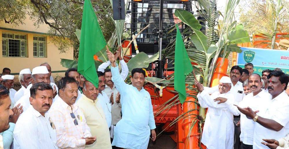 ಪಟ್ಟಣದ ಕೃಷಿ ಇಲಾಖೆಯ ಆವರಣದಲ್ಲಿ ೨೦೨೪-೨೫ನೆಯ ಸಾಲಿನ ಕೃಷಿ ಇಲಾಕೆಯ ವತಿಯಿಂದ ಹೈಟೆಕ್ ಹಾರ್ವೇಸ್ಟರ್ ಯೋಜನೆಯ ಅಡಿಯಲ್ಲಿ ಕಬ್ಬು ಕಟಾವ್ ಯಂತ್ರವನ್ನು ವಿತರಣೆ ಮಾಡಿ ಮಾತನಾಡಿದರು.