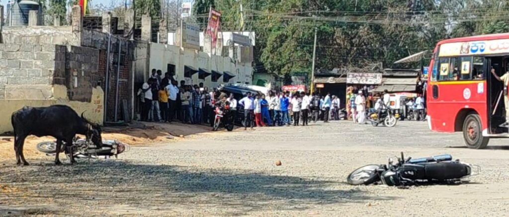 ಮುದ್ದೇಬಿಹಾಳ: ಮದವೇರಿದ ಎಮ್ಮೆಯೊಂದು ಇಲ್ಲಿನ ಬಸ್ ನಿಲ್ದಾಣದಲ್ಲಿ ನುಗ್ಗಿ ಇಬ್ಬರು ಬೈಕ್ ಸವಾರರಿಗೆ ಗುದ್ದಿ ಚಿಕ್ಕ ಪುಟ್ಟ ಗಾಯಗೊಳಿಸಿದ ಘಟನೆ ಗುರುವಾರ ಬೆಳಿಗ್ಗೆ ನಡೆದಿದೆ.