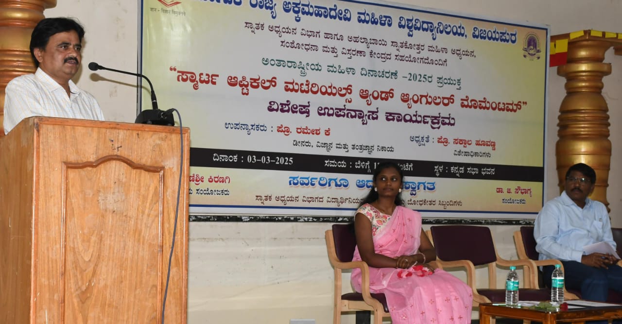 ನಗರದ ಕರ್ನಾಟಕ ರಾಜ್ಯ ಅಕ್ಕಮಹಾದೇವಿ ಮಹಿಳಾ ವಿಶ್ವವಿದ್ಯಾನಿಲಯದಲ್ಲಿ ಅಂತರಾಷ್ಟ್ರೀಯ ಮಹಿಳಾ ದಿನಾಚರಣೆಯ ಅಂಗವಾಗಿ ಬುಧವಾರ ಆಯೋಜಿಸಿದ್ದ ‘ಸ್ಮಾರ್ಟ ಆಪ್ಟಿಕಲ್ ಮಟೆರಿಯಲ್ಸ ಆ್ಯಂಡ್ ಆ್ಯಂಗುಲರ್ ಮೊಮೆಂಟಮ್’ ಎಂಬ ವಿಶೇಷ ಉಪನ್ಯಾಸದಲ್ಲಿ ಕಾರ್ಯಕ್ರಮದಲ್ಲಿ ಅವರು ಮಾತನಾಡಿದರು.