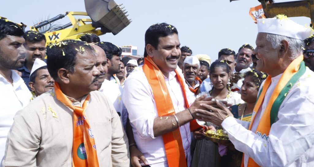 ಕೊಲ್ಹಾರ: ಬಿಜೆಪಿ ಜನಾಕ್ರೋಶ ಯಾತ್ರೆ ಅಂಗವಾಗಿ ವಿಜಯಪುರ ಜಿಲ್ಲೆಗೆ ಬಾಗಲಕೋಟೆ ಯಿಂದ ಆಗಮಿಸಿದ ಬಿಜೆಪಿ ರಾಜ್ಯಾಧ್ಯಕ್ಷ ಬಿ.ವೈ. ವಿಜಯೇಂದ್ರ ಅವರನ್ನು ಕೊಲ್ಹಾರ ಪಟ್ಟಣದ ಯುಕೆಪಿಯಲ್ಲಿ ಮಾಜಿ ಸಚಿವ ಎಸ್.ಕೆ. ಬೆಳ್ಳುಬ್ಬಿ ನೇತೃತ್ವದಲ್ಲಿ ಕಾರ್ಯಕರ್ತರು ಸನ್ಮಾನಿಸಿ, ಮಹಿಳೆಯರು ಆರತಿ ಮಾಡಿ, ಜೆಸಿಬಿ ಮೂಲಕ ಹೂ ಮಳೆಗರೆದು ಅದ್ದೂರಿಯಾಗಿ ಜಿಲ್ಲೆಗೆ ಸ್ವಾಗತಿಸಿದರು.