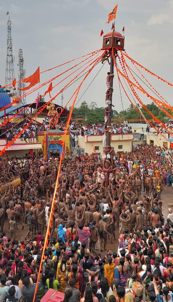 ಏನಿದು ವಿಶೇಷ: ದೇವಸ್ಥಾನದ ಎದುರು 52 ಅಡಿ ಎತ್ತರದ ಕಂಬವನ್ನು ನೆಟ್ಟು ಅದರ ಮೇಲೆ ವ್ಯಕ್ತಿಯನ್ನು ಕೂಡಿಸಲಾಗಿತ್ತು. ಈ ಕಂಬಕ್ಕೆ ಜಾರುವ ಪದಾರ್ಥ ಲೇಪಿಸಲಾಗಿತ್ತು. ಸ್ಪರ್ಧೆಗೆ ಬಂದ ಯುವಕರು ಈ ಕಂಬ ಹತ್ತಿ ಮೇಲೆ ಕುಳಿತ ವ್ಯಕ್ತಿಯನ್ನು ಕೆಳಗೆ ಇಳಿಸಬೇಕು.