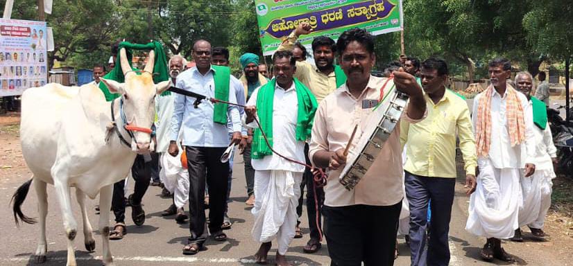 ಇಲ್ಲಿಯ ರಾಮಲಿಂಗೇಶ್ವರ ದೇವಸ್ಥಾನದಿಂದ ಹೊರಟ ಪ್ರತಿಭಟನಾ ಮೆರವಣಿಗೆಯಲ್ಲಿ ಅಧಿಕಾರಿಗಳ ವಿರುದ್ಧ ಘೋಷಣೆ ಕೂಗಲಾಯಿತು. ಹಲಗೆ ವಾದನ, ಎತ್ತುಗಳೊಂದಿಗೆ ಮೆರವಣಿಗೆ ನಡೆಯಿತು.