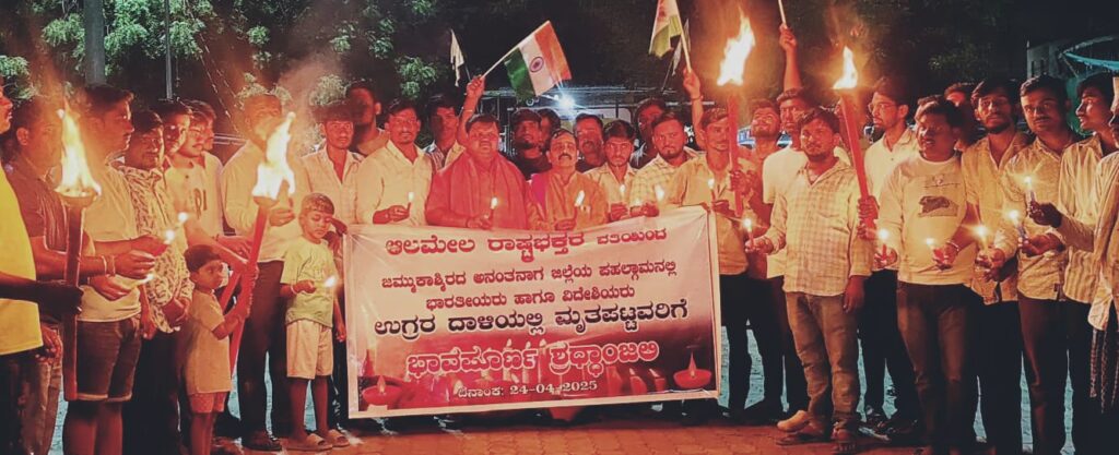 ಗುರುವಾರ ರಾತ್ರಿ ಮೇನ್ ಬಜಾರದ ದೇವಿ ಗುಡಿಯ ಬಳಿ ಹಿಂದೂ ಕಾರ್ಯರ್ತರು ಕಾಶ್ಮೀರದಲ್ಲಿ ನಡೆದ ಉಗ್ರರ ಹತ್ಯ ಖಂಡಿಸಿ ಮೇಣದ ಬತ್ತಿ ಹಚ್ಚಿ ಪಟ್ಟಣದ ಪ್ರಮುಖ ಬಿದಿಗಳಲ್ಲಿ ಪಂಜು ಹಿಡಿದು ಮೌನ ಮೆರವಣಿಗೆ ಮಾಡುವ ಮೂಲಕ ಪ್ರತಿಭಟಿಸಿ ಮೃತರ ಆತ್ಮಕ್ಕೆ ಶಾಂತಿ ಕೋರಿ ಶ್ರದ್ದಾಂಜಲಿ ಅರ್ಪಿಸಿದರು.