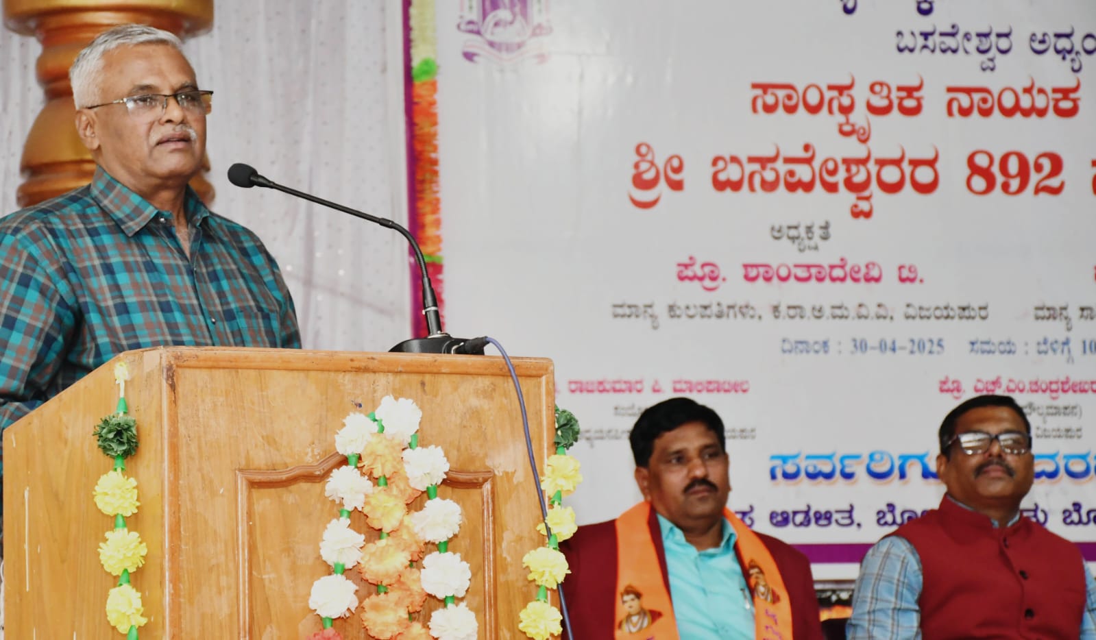 ನಗರದ ಕರ್ನಾಟಕ ರಾಜ್ಯ ಅಕ್ಕಮಹಾದೇವಿ ಮಹಿಳಾ ವಿಶ್ವವಿದ್ಯಾಲಯದಲ್ಲಿ ಬುಧವಾರ ಆಯೋಜಿಸಿದ್ದ ಸಾಂಸ್ಕೃತಿಕ ನಾಯಕ ಮತ್ತು ವಿಶ್ವಗುರು ಶ್ರೀ ಬಸವೇಶ್ವರರ ೮೯೨ ನೇ ಜಯಂತ್ಯೋತ್ಸವ ಕಾರ್ಯಕ್ರಮದಲ್ಲಿ ಅವರು ಮಾತನಾಡಿದರು.