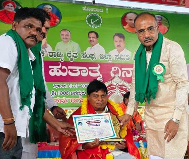 ದೇವರಹಿಪ್ಪರಗಿ: ಪಟ್ಟಣದ ಪಂಚಾಚಾರ್ಯ ಕಲ್ಯಾಣ ಮಂಟಪದಲ್ಲಿ ಇತ್ತೀಚಿಗೆ ಜರುಗಿದ ರೈತ ಹುತಾತ್ಮ ದಿನಾಚರಣೆ ಕಾರ್ಯಕ್ರಮದಲ್ಲಿ ಶಾಸಕ ರಾಜುಗೌಡ ಪಾಟೀಲ(ಕುದರಿ ಸಾಲವಾಡಗಿ) ತಾಲ್ಲೂಕಿನ ಪ್ರಗತಿಪರ ಸಾವಯವ ಕೃಷಿಕ ಹಾಗೂ ನಿವೃತ್ತ ಶಿಕ್ಷಕ ಎಮ್.ಎಸ್.ಅರ್ಜುಣಗಿ ಇವರಿಗೆ ಜೋಡಿರತ್ನ ಪ್ರಶಸ್ತಿ ನೀಡಿ ಸನ್ಮಾನಿಸಿದರು.