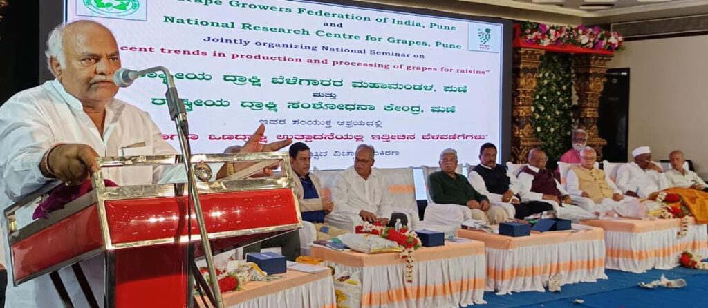 ಭಾನುವಾರ ನಗರದಲ್ಲಿ ಮಹಾರಾಷ್ಟ್ರದ ಪುಣೆಯ ರಾಷ್ಟ್ರೀಯ ದ್ರಾಕ್ಷಿ ಬೆಳೆಗಾರರ ಮಹಾಮಂಡಳ, ರಾಷ್ಟ್ರೀಯ ದ್ರಾಕ್ಷಿ ಸಂಶೋಧನಾ ಕೇಂದ್ರದ ಸಹಯೋಗದಲ್ಲಿ ಹಮ್ಮಿಕೊಂಡಿದ್ದ ದ್ರಾಕ್ಷಿ ಹಾಗೂ ಒಣದ್ರಾಕ್ಷಿ ಉತ್ಪಾದನೆಯಲ್ಲಿ ಇತ್ತೀಚಿನ ಬೆಳವಣಿಗೆಗಳ ಕುರಿತು ರಾಷ್ಟ್ರ ಮಟ್ಟದ ವಿಚಾರ ಸಂಕಿರಣಕ್ಕೆ ಚಾಲನೆ ನೀಡಿ ಮಾತನಾಡಿದ ಅವರು, ದ್ರಾಕ್ಷಿ ಬೆಳೆಗಾರರ ಹಿತದೃಷ್ಟಿಯಿಂದ ಸರ್ಕಾರಿ, ಅನುದಾನಿತ ಶಾಲೆಗಳಲ್ಲಿ ಮಕ್ಕಳಿಗೆ ಹಾಲು, ಮೊಟ್ಟೆ, ಬಾಳೆಹಣ್ಣು ವಿತರಣೆ ಜೊತೆಗೆ ಒಣದ್ರಾಕ್ಷಿ ವಿತರಣೆ ಕುರಿತು ಮುಖ್ಯಮಂತ್ರಿ ಸಿದ್ಧರಾಮಯ್ಯ ಅವರೊಂದಿಗೆ ಚರ್ಚಿ, ವಿಜಯಪುರದಲ್ಲಿ ನಡೆಯಲಿರುವ ಸಂಪುಟ ಸಭೆಯಲ್ಲಿ ಚರ್ಚಿಸುವುದಾಗಿ ಭರವಸೆ ನೀಡಿದರು.