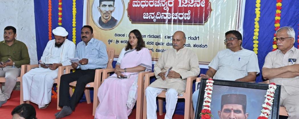ವಿಜಯಪುರ: ಕನ್ನಡ ಮತ್ತು ಸಂಸ್ಕೃತಿ ಇಲಾಖೆ ಹಾಗೂ ಹಲಸಂಗಿ ಗೆಳೆಯರ ಪ್ರತಿಷ್ಠಾನದ ವತಿಯಿಂದ ಮಧುರಚೆನ್ನರ ೧೨೨ನೇ ಜನ್ಮ ದಿನಾಚರಣೆಯನ್ನು ಜು.೩೧ರ ಗುರುವಾರ ಹಲಸಂಗಿ ಗ್ರಾಮದ ಶ್ರೀ ಅರವಿಂದ ಸಂಯುಕ್ತ ಪದವಿ ಪೂರ್ವ ಮಹಾವಿದ್ಯಾಲಯದಲ್ಲಿ ಆಚರಿಸಲಾಯಿತು.