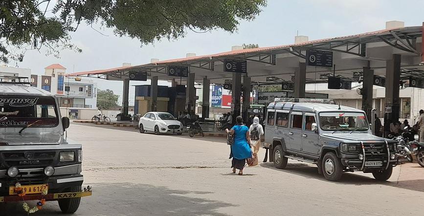 ಪಟ್ಟಣದ ಬಸ್ ನಿಲ್ದಾಣದ ಆವರಣದಲ್ಲಿ ಮಂಗಳವಾರ ಬೆಳಿಗ್ಗೆ ಕೆಲವು ಗ್ರಾಮದಿಂದ ಬಸ್ಗಳು ಆಗಮಿಸಿದವು, ಮುಂದೆ ಕೆಲವು ಡಿಪೋಗಳಿಗೆ ತೆರಳಿದರೆ ಬೆರಳೆಣಿಕೆಯ ಬಸ್ಗಳು ನಿಲ್ದಾಣದಲ್ಲಿ ನಿಂತವು.