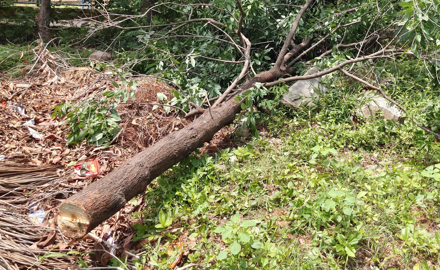 ಎರಡು ಮರಗಳನ್ನು ಕತ್ತರಿಸಿ, ಅವುಗಳನ್ನು ಒಯ್ಯಲು ಸಾಧ್ಯವಾಗದೇ ಅಲ್ಲಿಯೇ ಎಸೆದು ಕಳ್ಳರು ಪಾರಾಗಿದ್ದಾರೆ.