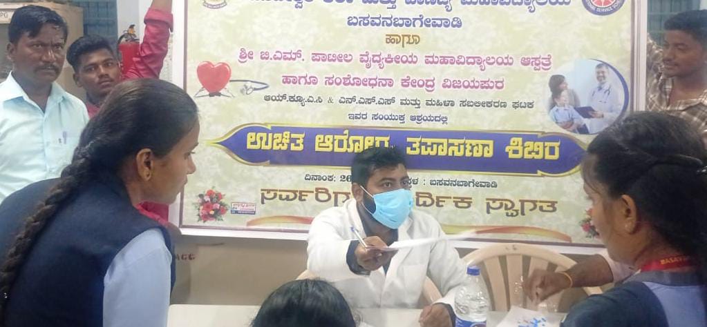 ಪಟ್ಟಣದ ಬಿ.ಎಲ್.ಡಿ.ಇ.ಸಂಸ್ಥೆಯ ಬಸವೇಶ್ವರ ಕಲಾ ಮತ್ತು ವಾಣಿಜ್ಯ ಮಹಾವಿದ್ಯಾಲಯದಲ್ಲಿ ವಿಜಯಪುರದ ಬಿ.ಎಮ್.ಪಾಟೀಲ ವೈದ್ಯಕೀಯ ಮಹಾವಿದ್ಯಾಲಯ ಹಾಗೂ ಸಂಶೋಧನಾ ಕೇಂದ್ರ, ಮಹಾವಿದ್ಯಾಲಯದ ಆಯ್.ಕ್ಯೂ.ಎ.ಸಿ, ಎನ್.ಎಸ್.ಎಸ್ ಹಾಗೂ ಮಹಿಳಾ ಸಬಲೀಕರಣ ಘಟಕಗಳ ಸಹಯೋಗದಲ್ಲಿ ಶುಕ್ರವಾರ ಹಮ್ಮಿಕೊಂಡಿದ್ದ ಉಚಿತ ಆರೋಗ್ಯ ತಪಾಸಣಾ ಶಿಬಿರವನ್ನು ಉದ್ಘಾಟಿಸಿ ಮಾತನಾಡಿದ ಅವರು, ಪ್ರಸ್ತುತ ದಿನಮಾನದಲ್ಲಿ ಆಹಾರವು ಕಲಬೆರಕೆ ಹಾಗೂ ರಾಸಾಯನಿಕಯುಕ್ತವಾಗಿರುವುದರಿಂದ ಉತ್ತಮ ಆರೋಗ್ಯವನ್ನು ಕಾಪಾಡಿಕೊಳ್ಳಲು ಹಾಗೂ ರಾಸಾಯನಿಕಯುಕ್ತವಾಗಿರುವುದರಿಂದ ಉತ್ತಮ ಆರೋಗ್ಯವನ್ನು ಕಾಪಾಡಿಕೊಳ್ಳಲು ಸಾಧ್ಯವಾಗುತ್ತಿಲ್ಲ. ಇಂತಹ ಸಂದಿಗ್ಧ ಪರಿಸ್ಥಿತಿಯಲ್ಲಿ ನಾವು ಉತ್ತಮ ಆರೋಗ್ಯವನ್ನು ಕಾಪಾಡಿಕೊಳ್ಳುವಲ್ಲಿ ಮುಂಚೂಣಿಯಲ್ಲಿರಬೇಕೆಂದು ಅಭಿಪ್ರಾಯಪಟ್ಟರು.