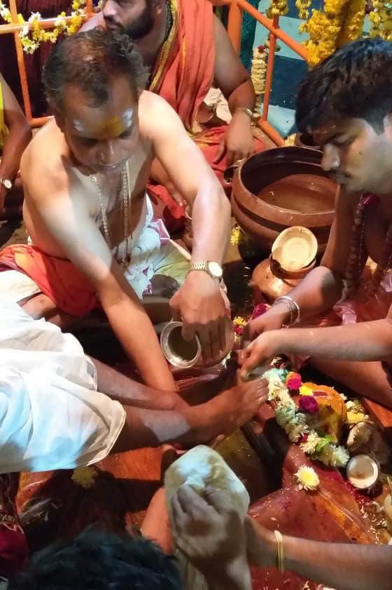 ಈ ಬಿಂದಿಗೆಯನ್ನು ಶ್ರೀಮಠದ ಪೂಜಾ ಸ್ಥಳದಲ್ಲಿ ಗೌರವಪೂರ್ವಕವಾಗಿ ಪ್ರತಿಷ್ಠಾಪಿಸಲಾಗುತ್ತದೆ. ಬಳಿಕ ನೂರಾರು ವೈದಿಕ ಬ್ರಾಹ್ಮಣರನ್ನು ಆಹ್ವಾನಿಸಿ ಪಾದಪೂಜೆ ಕಾರ್ಯಕ್ರಮ ನಡೆಯುತ್ತದೆ. ಪಾದಪೂಜೆಯು ಮುಗಿದ ನಂತರ, ಆ ನೂರಾರು ಬ್ರಾಹ್ಮಣರ ಪಾದಪೂಜೆಗೆ ಬಳಸಿದ ಪವಿತ್ರ ನೀರನ್ನು ಒಂದೇ ಒಂದು ಚಿಕ್ಕ ಮಣ್ಣಿನ ಬಿಂದಿಗೆಯೊಳಗೆ ಸುರಿಯಲಾಗುತ್ತದೆ.