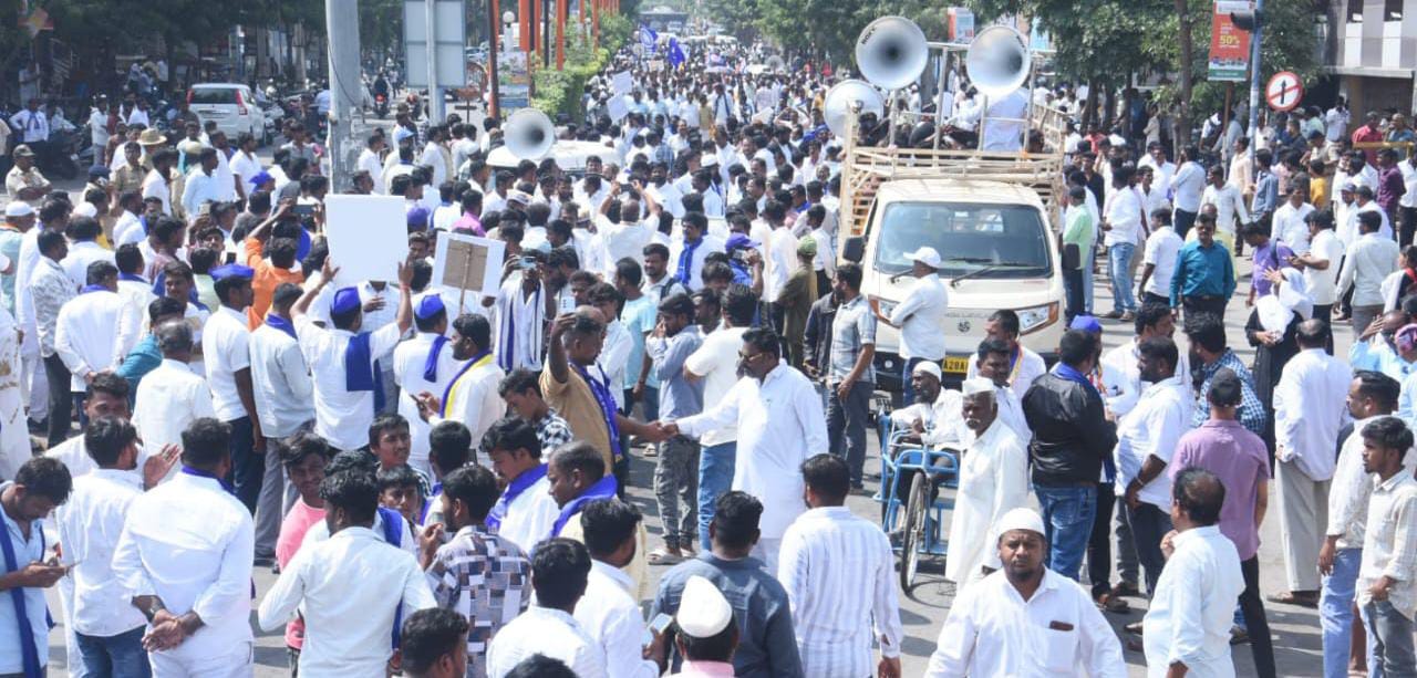 ನ್ಯಾಯಮೂರ್ತಿ ಬಿ.ಆರ್. ಗವಾಯಿ ಅವರ ಮೇಲೆ ಷೂ ಎಸೆದ ಘಟನೆಯನ್ನು ಖಂಡಿಸಿ ಪ್ರತಿಭಟನೆ ಕಾವು ಜೋರಾಗಿತ್ತು. ಹತ್ತಾರು ದಿಕ್ಕಿನಿಂದ ಪ್ರತಿಭಟನಾಕಾರರು ಘೊಷಣೆ ಕೂಗುತ್ತಾ ಶ್ರೀ ಸಿದ್ದೇಶ್ವರ ದೇವಾಲಯ ಎದುರು ಜಮಾಯಿಸಿದರು.