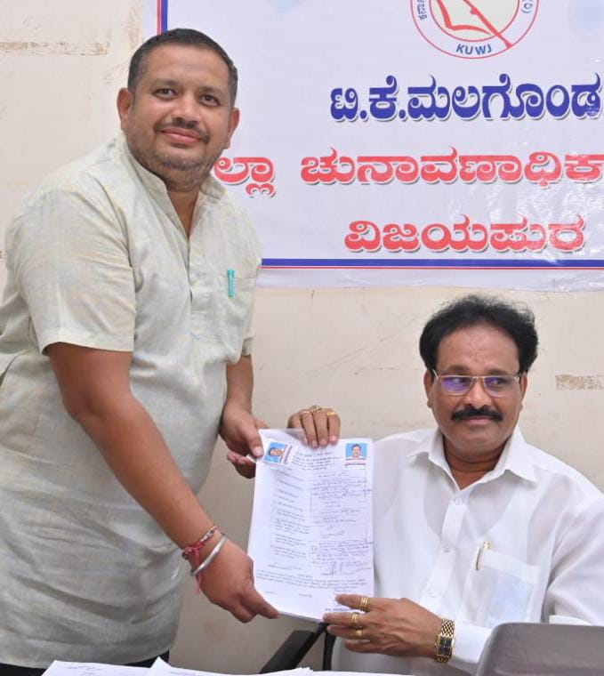 ವಿಜಯಪುರ: ಕಾರ್ಯನಿರತ ಪತ್ರಕರ್ತರ ಸಂಘ (ರಿ) ವಿಜಯಪುರ ಜಿಲ್ಲಾ ಘಟಕದ ಚುನಾವಣೆಯಲ್ಲಿ ಪ್ರಧಾನ ಕಾರ್ಯದರ್ಶಿ ಸ್ಥಾನಕ್ಕೆ ಸ್ಪರ್ಧಿಸಲು “ಉದಯರಶ್ಮಿ” ದಿನಪತ್ರಿಕೆ ಸಂಪಾದಕ ಇಂದುಶೇಖರ ಮಣೂರ ಅವರು ಶುಕ್ರವಾರ ಜಿಲ್ಲಾ ಚುನಾವಣಾಧಿಕಾರಿ ಟಿ.ಕೆ.ಮಲಗೊಂಡ ಅವರಿಗೆ ನಾಮಪತ್ರ ಸಲ್ಲಿಸಿದರು.