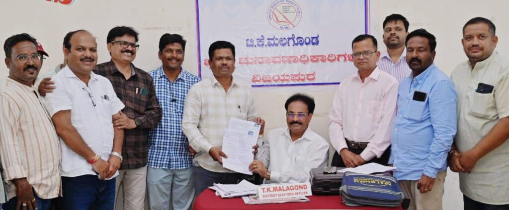 ವಿಜಯಪುರ: ಕಾರ್ಯನಿರತ ಪತ್ರಕರ್ತರ ಸಂಘ (ರಿ) ವಿಜಯಪುರ ಜಿಲ್ಲಾ ಘಟಕದ ಚುನಾವಣೆಯಲ್ಲಿ ಜಿಲ್ಲಾಧ್ಯಕ್ಷ ಸ್ಥಾನಕ್ಕೆ ಸ್ಪರ್ಧಿಸಲು ಹಿರಿಯ ಪತ್ರಕರ್ತ ಹಾಗೂ ಟಿವಿ೯ ಜಿಲ್ಲಾ ವರದಿಗಾರ ಅಶೋಕ ಯಡಳ್ಳಿ ಅವರು ಶುಕ್ರವಾರ ಜಿಲ್ಲಾ ಚುನಾವಣಾಧಿಕಾರಿ ಟಿ.ಕೆ.ಮಲಗೊಂಡ ಅವರಿಗೆ ತಮ್ಮ ನಾಮಪತ್ರ ಸಲ್ಲಿಸಿದರು.