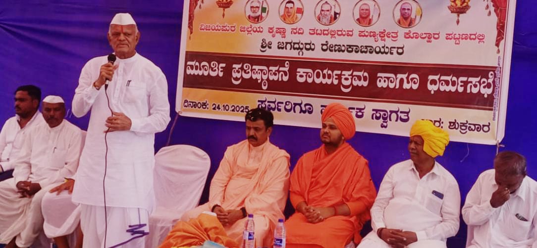 ಪಟ್ಟಣದ ಪಂಚಾಚಾರ್ಯ ವಿಧ್ಯಾವರ್ಧಕ ಸಂಘದವರು ಸಂತೆ ಮೈದಾನ ಹತ್ತಿರ ನಿರ್ಮಿಸಿರುವ ರೇಣುಕಾಚಾರ್ಯ ದೇವಸ್ಥಾನದಲ್ಲಿ ರೇಣುಕಾಚಾರ್ಯರ ಮೂರ್ತಿಯ ಪ್ರತಿಷ್ಠಾಪಣೆ ಕಾರ್ಯಕ್ರಮ ಹಾಗೂ ಧರ್ಮಸಭೆ ಸಮಾರಂಭದಲ್ಲಿ ಮಾತನಾಡಿದರು.