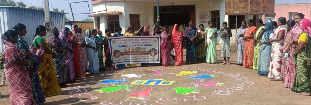 ಆಳೂರ ಗ್ರಾಮ ಪಂಚಾಯತಿ ಮತ್ತು ಮಾವಿನಹಳ್ಳಿಯಲ್ಲಿ ಬಸ್ ನಿಲ್ದಾಣ ಎದುರುಗಡೆ ವಿವಿಧ ಬಗೆಯ ರಂಗೋಲಿ ಹಾಕಿ ಪ್ರತಿಭಟನೆ ಮುಖಾಂತರ ಜನರಲ್ಲಿ ಜಾಗೃತಿ ಮೂಡಿಸಿದರು.