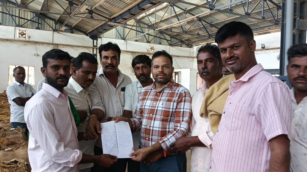 ತಂಬಾಕು ಹರಾಜು ಮಾರುಕಟ್ಟೆ 65ರ ಸೂಪರಿಂಟೆಂಡೆಂಟ್ ವಿಜಯ್ ಕುಮಾರ್ ಗೆ ಮನವಿ ಪತ್ರ ಸಲ್ಲಿಸಿದರು. ವೇಳೆ ಪೃಥ್ವಿ ಕುಮಾರ್ , ರವಿಕುಮಾರ್ ಸಿಕೆ, ನೀಲಕಂಠೇಗೌಡ, ರಾಜೇಂದ್ರಗೌಡ ಸೇರಿದಂತೆ ಬೆಳೆಗಾರರು ಇದ್ದರು.
