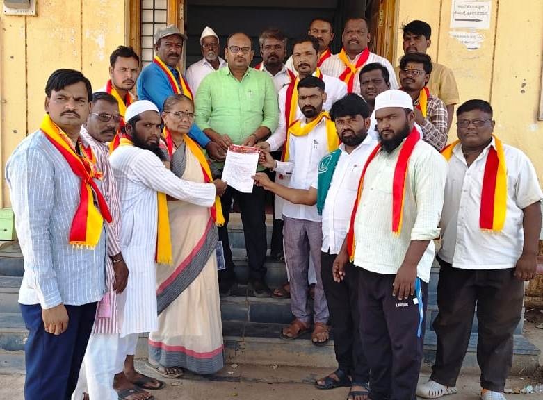 ಪಟ್ಟಣದ ತಹಶೀಲ್ದಾರ ಕಚೇರಿಗೆ ಶುಕ್ರವಾರ ಆಗಮಿಸಿದ ನಮ್ಮ ಕರ್ನಾಟಕ ಸೇನೆಯ ಪದಾಧಿಕಾರಿಗಳು ತರಕಾರಿ ಮಾರಾಟಗಾರರ ಕುರಿತು ತಹಶೀಲ್ದಾರ ಅವರ ಗಮನ ಸೆಳೆದರು.