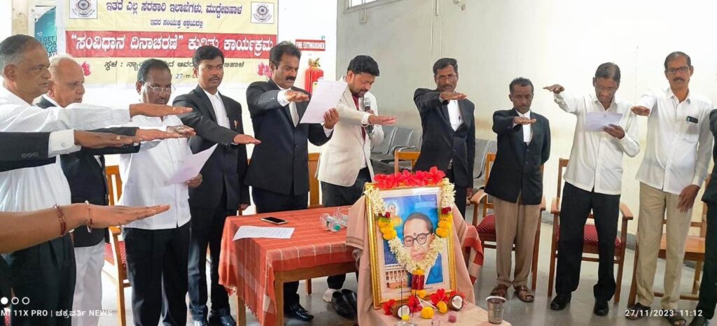 ಪಟ್ಟಣದ ನ್ಯಾಯಾಲಯದ ಆವರಣದಲ್ಲಿ ತಾಲೂಕು ಕಾನೂನು ಸೇವಾ ಸಮಿತಿ, ನ್ಯಾಯವಾದಿಗಳ ಸಂಘ ಹಾಗೂ ಇತರ ಎಲ್ಲ ಸರಕಾರಿ ಇಲಾಖೆಗಳ ಸಂಯುಕ್ತ ಆಶ್ರಯದಲ್ಲಿ ಹಮ್ಮಿಕೊಳ್ಳಲಾಗಿದ್ದ ಸಂವಿಧಾನ ದಿನಾಚರಣೆ ಕಾರ್ಯಕ್ರಮದಲ್ಲಿ ಪ್ರತಿಜ್ಞಾವಿಧಿ ಬೋಧಿಸಿ ಅವರು ಮಾತನಾಡಿದರು.