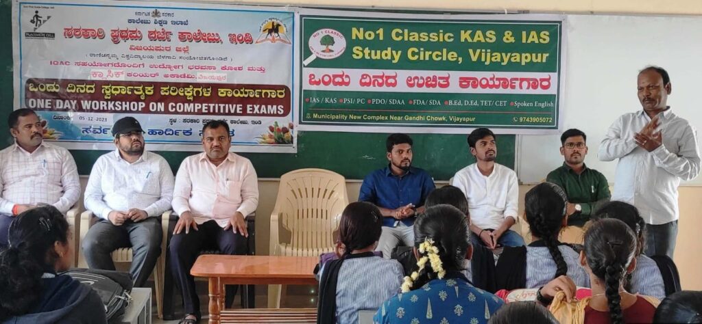 ಇಂಡಿ: ಅವಕಾಶಗಳು ಎಲ್ಲರಿಗೂ ಸಮನಾಗಿದ್ದು, ಅದನ್ನು ಸರಿಯಾದ ಹಂತದಲ್ಲಿ ಉಪಯೋಗಿಸಿಕೊಳ್ಳುವವನು ಯಶಸ್ವಿಯಾಗುತ್ತಾನೆ ಎಂದು ಕ್ಲಾಸಿಕ್ ಸ್ಟಡಿ ಸರ್ಕಲ್ ನಿರ್ದೇಶಕ ವಿನೋದ ಬಿರಾದಾರ ಹೇಳಿದರು. ಹಾಗೂ ಕೆಎಎಸ್, ಪಿಎಸ್ಐ ಗೆ ಯಾವ ರೀತಿ ತಯಾರಿ ಮತ್ತು ಅದಕ್ಕೆ ಸಂಬಂಧ ಪಟ್ಟಿರುವ ಪಠ್ಯಕ್ರಮದ ಬಗ್ಗೆ ಚರ್ಚಿಸಿದರಲ್ಲದೇ, ಸ್ಪರ್ಧಾತ್ಮಕ ಪರೀಕ್ಷೆಯ ಮಾಹಿತಿಯನ್ನು ತಿಳಿಸಿಕೊಟ್ಟರು.